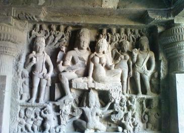 Shiva with his consort on mount Kailash, their abode, Ravana the demon king (of Ramayana fame) trying to disturb the couple by lifting the mountain. Shiva crushes Ravana's arrogance by pressing his toe down. All angels, and fairies (devatas) rejoice the scene. Ellora, India |